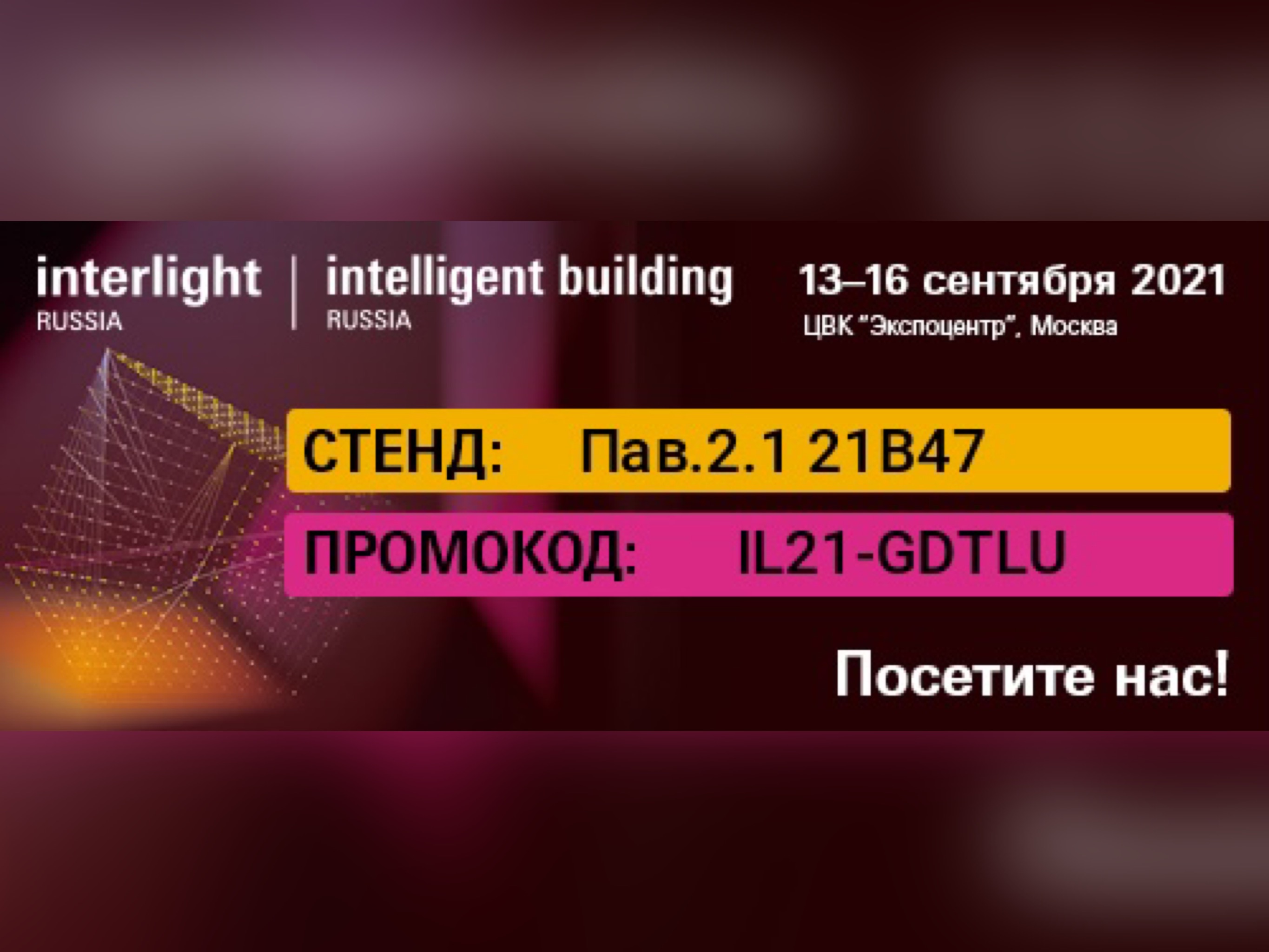 Приглашаем посетить наш стенд на выставке Interlight Russia | Intelligent building Russia, которая пройдет в Москве с 13 по 16 сентября.